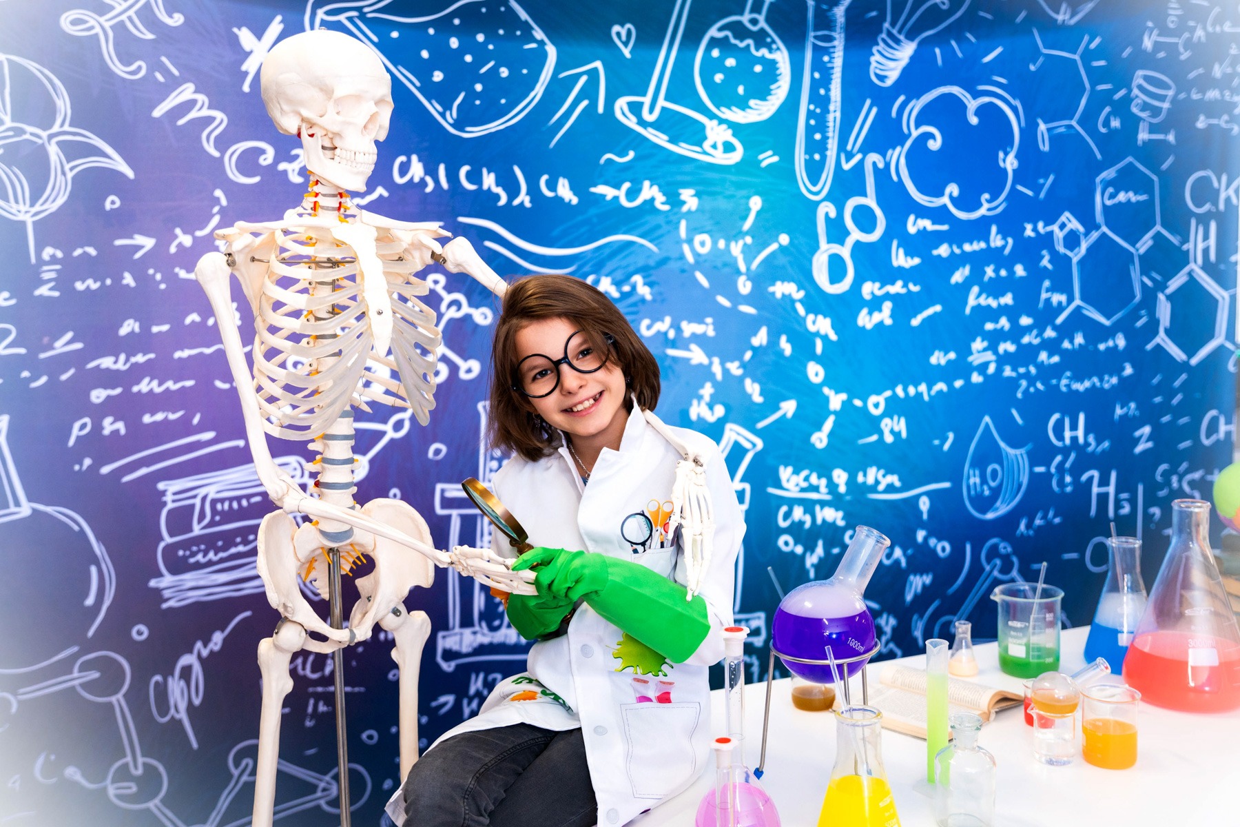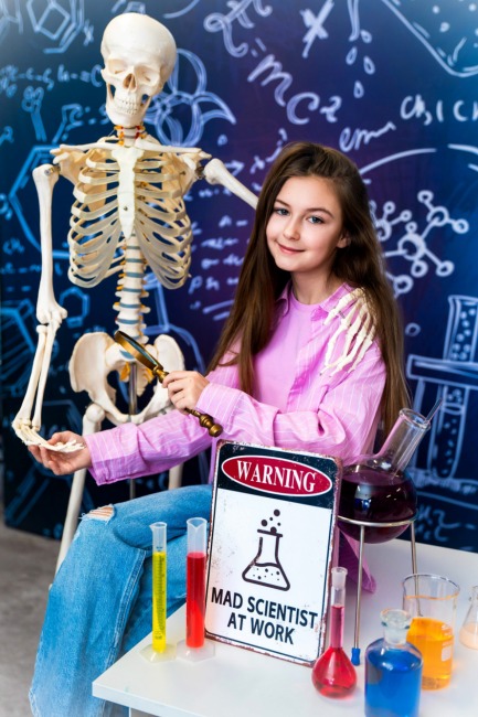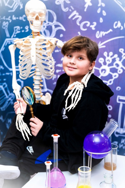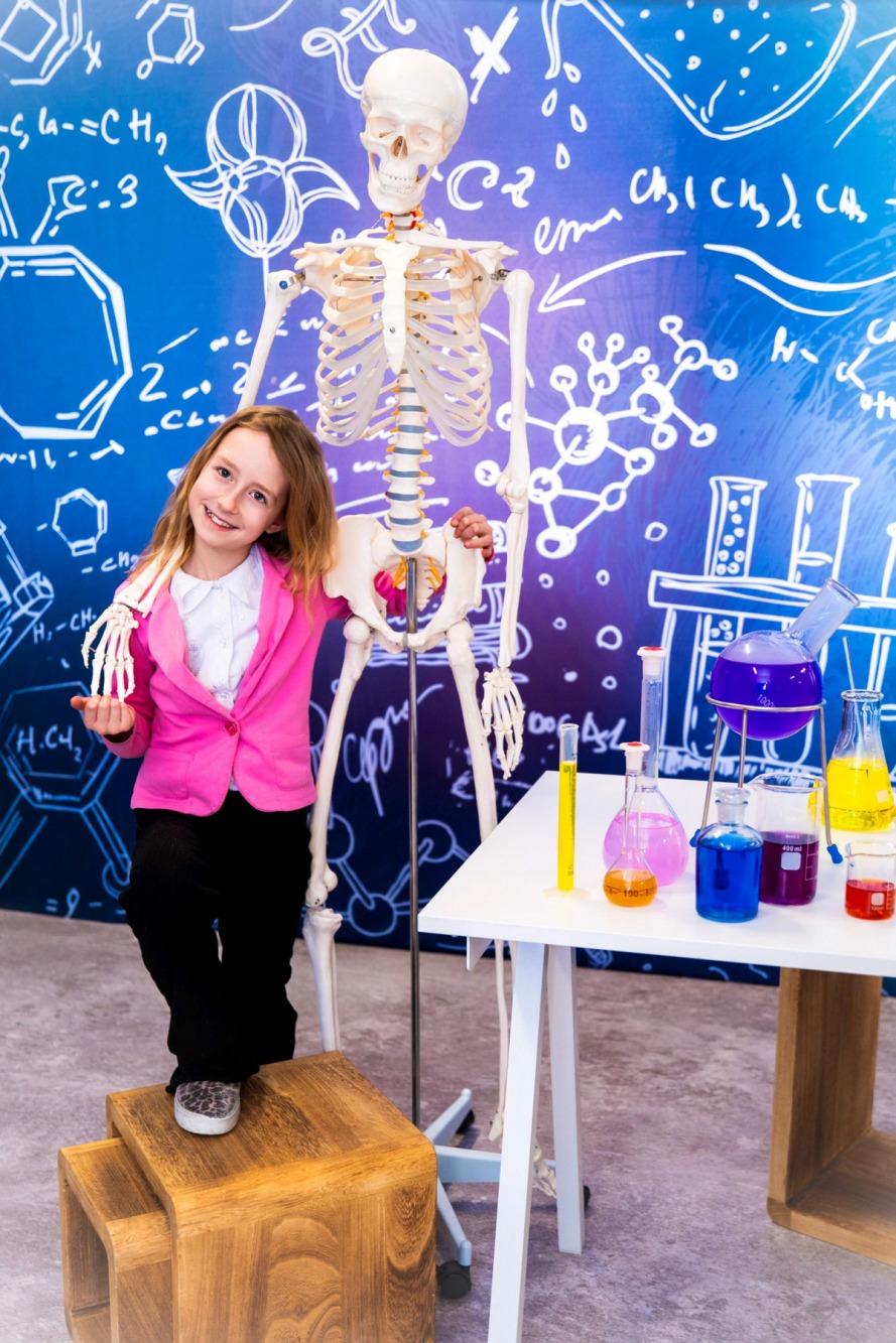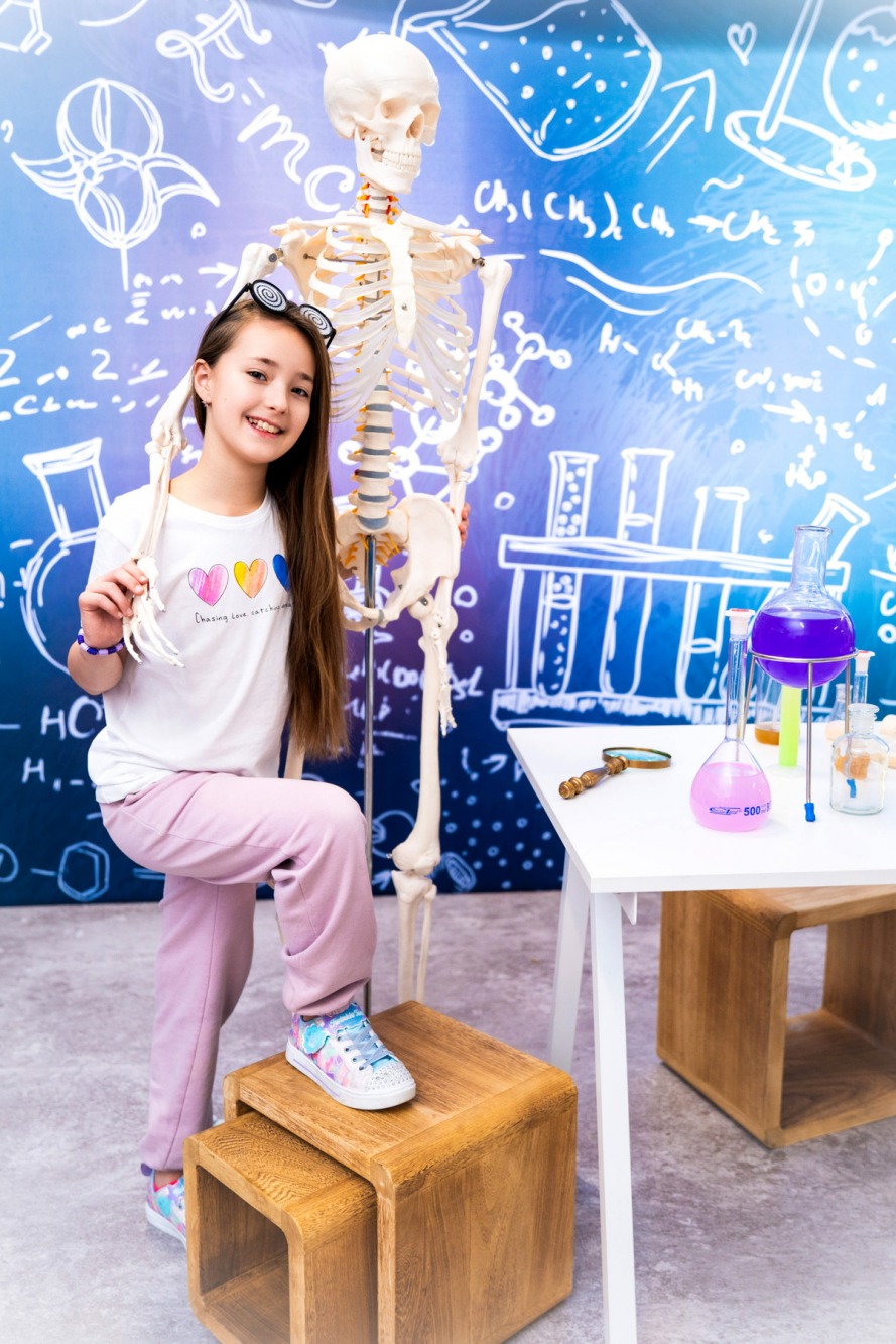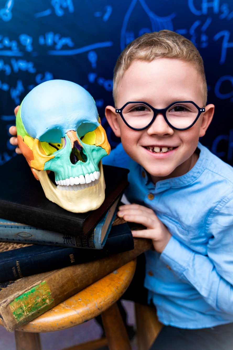 Sesja zdjęciowa „Szalony Naukowiec” to pełna dymu i tajemnic szkolna przygoda w laboratorium, wśród szkieletów, czaszek i kolorowych menzurek, gdzie dzieci mogą poczuć się jak prawdziwi odkrywcy nauki.