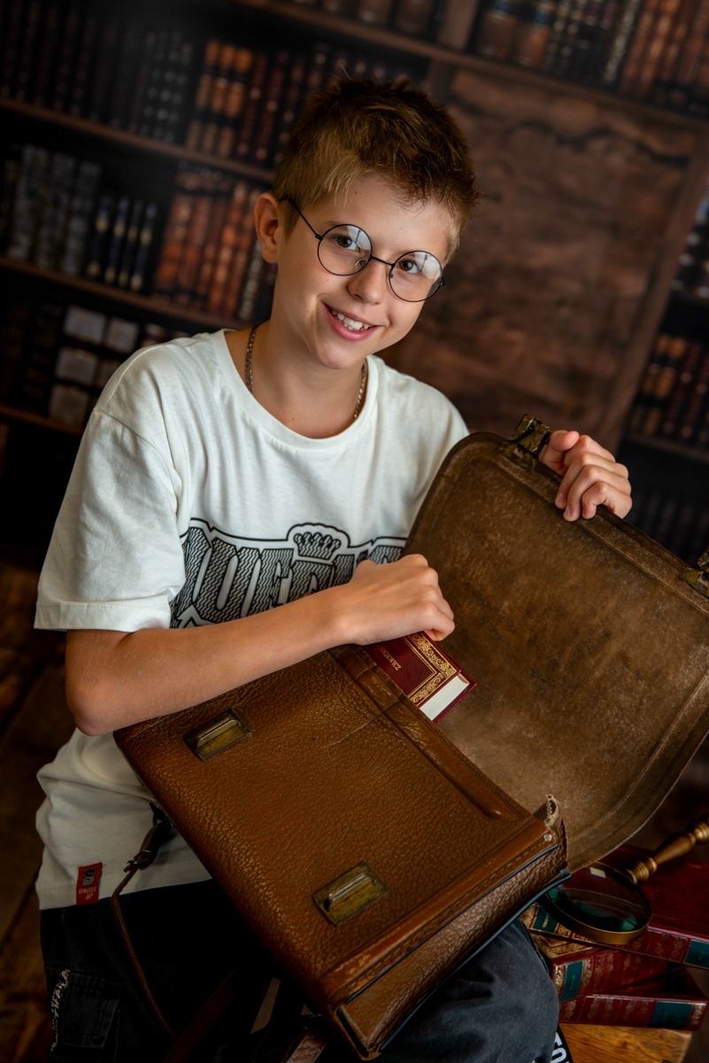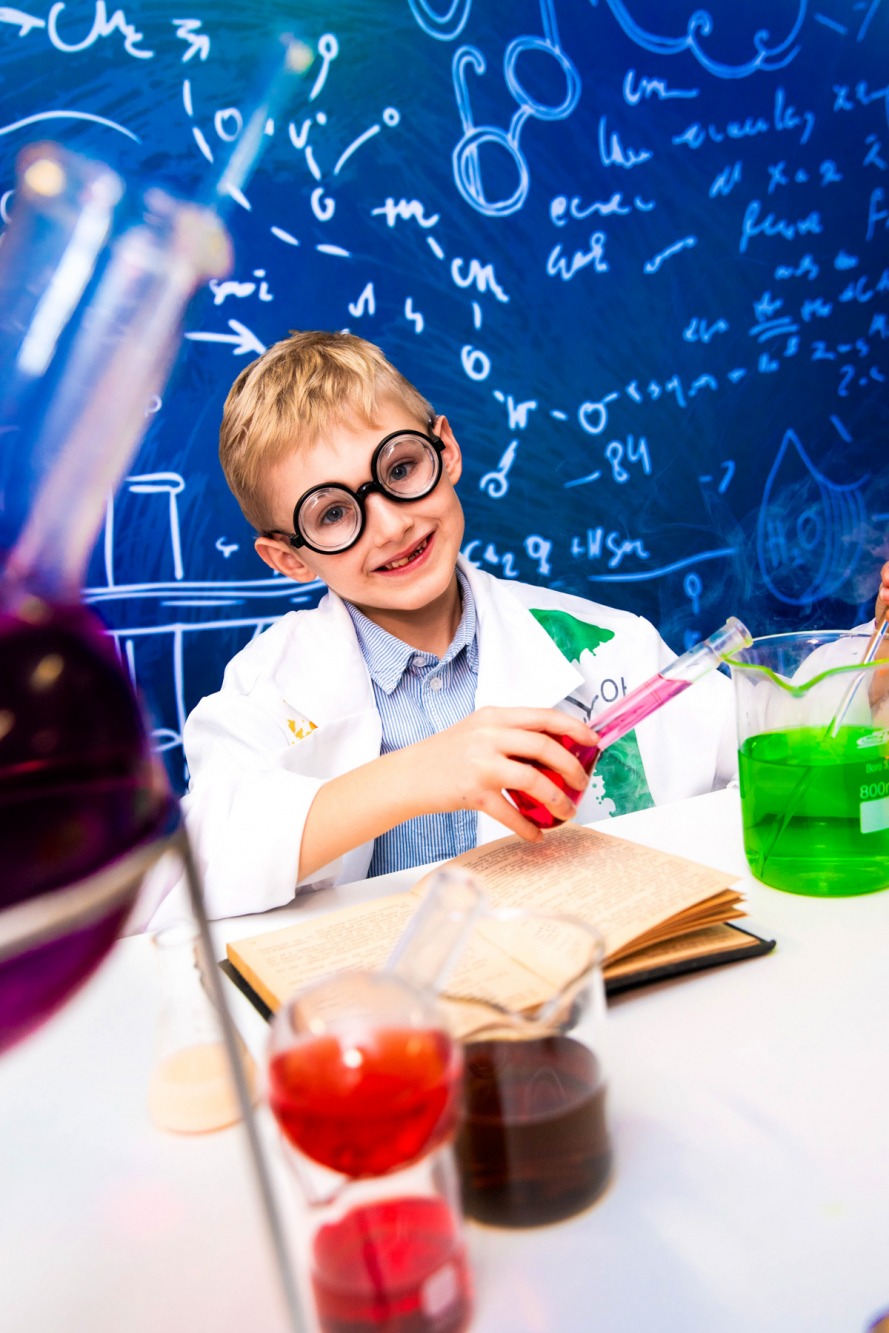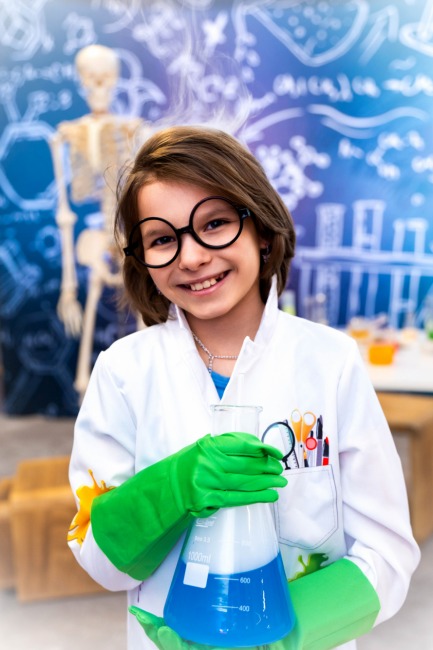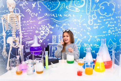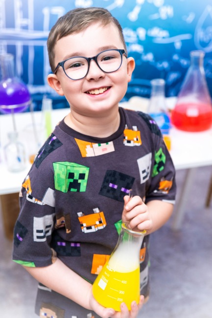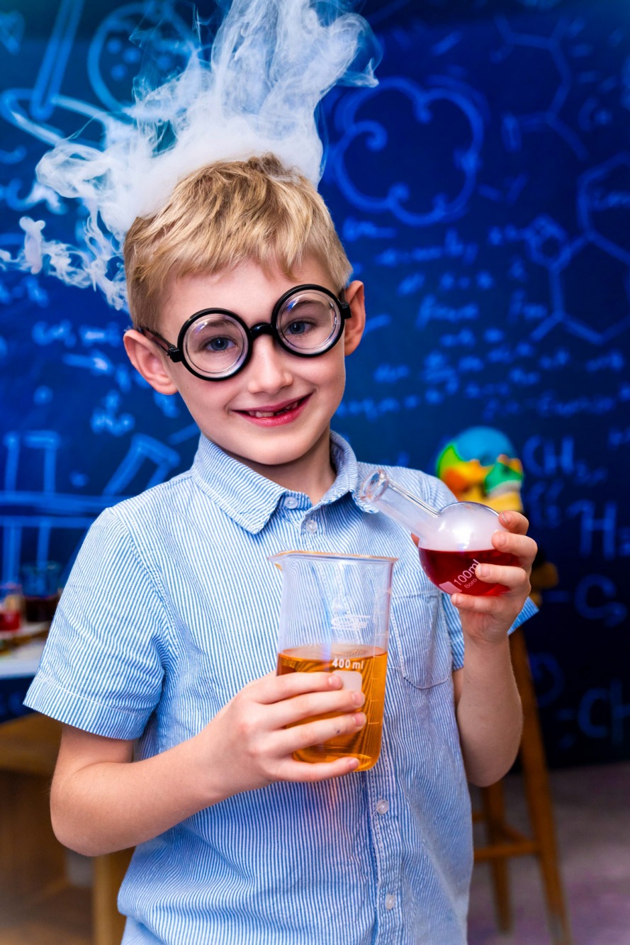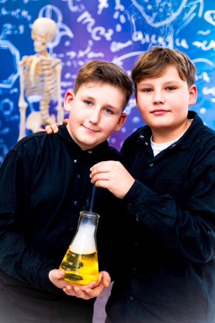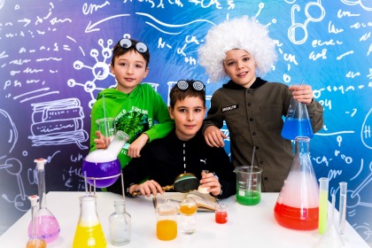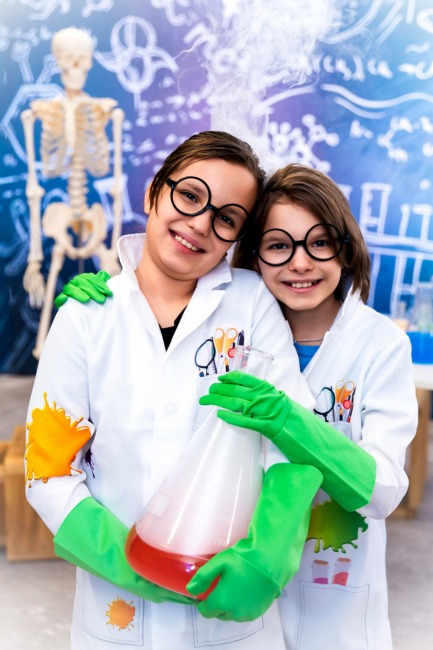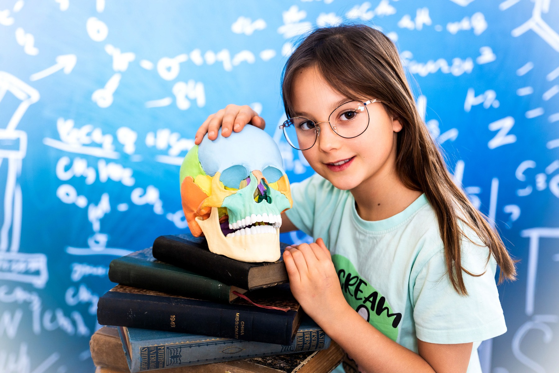 Sesja zdjęciowa „Szalony Naukowiec” to pełna dymu i tajemnic szkolna przygoda w laboratorium, wśród szkieletów, czaszek i kolorowych menzurek, gdzie dzieci mogą poczuć się jak prawdziwi odkrywcy nauki.